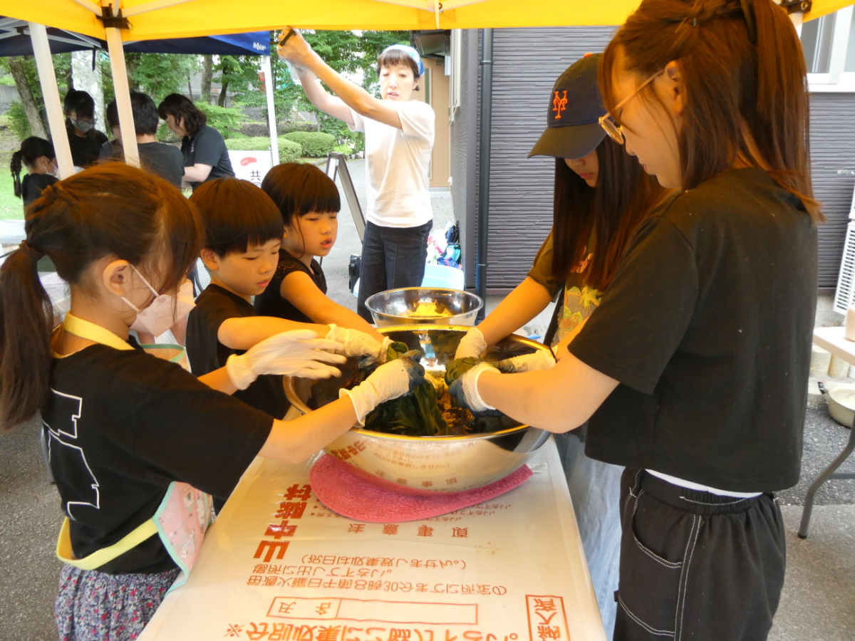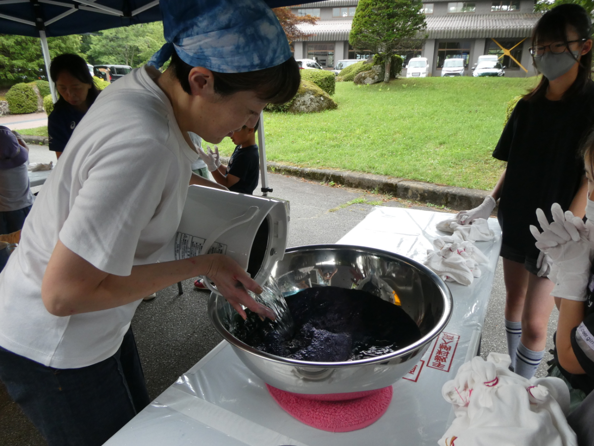 当日は、15名の村内児童が参加し、白いTシャツを縛ったり、輪ゴムで止めたり、思い思いに作業をしました。素敵な模様となり世界に一枚のTシャツを藍色に染め上げました。